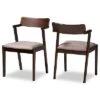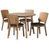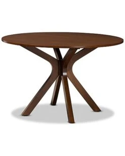 - Sleek curves and a warm finish define the Jana dining set. this wooden set includes one table and six chairs, each upholstered in a light fabric that complements the walnut brown wood finish. Designed for both comfort and style, each chair features a plush foam-padded seat, as well as an exquisite cut-out design on its back. Assembly is required and the round tabletop is supported by splayed legs that form a unique sculptural base, creating a chic profile from any angle. Well suited for both casual and formal dining, the Jana dining set is an excellent upgrade to any dining space. Table Dimensions: 29.9″ high x 47.2″ wide x 47.2″ deep; Legs: 29.1″ high; Chair Dimensions: 37.4″ high x 18.1″ wide x 20.3″ deep; Seating dimensions: 18.7″ wide x 15.7″ deep x 17.9″ high (from Floor); Back: 19.7″ high; Legs: 16.9″ high;