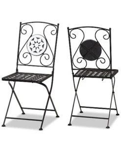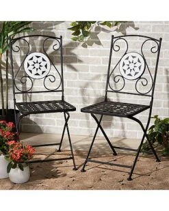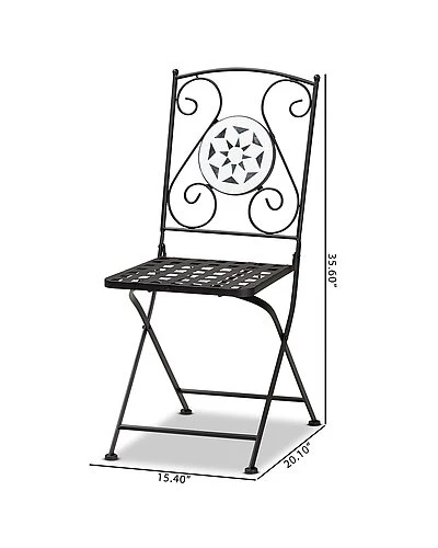 - Dine under the soothing warmth of the sun with the remarkable Julius outdoor dining chair. this chair is comprised of a sturdy metal frame. Its backrest features an open design embellished with a stunning mosaic design made from colored glass accents. The Julius will arrive fully assembled and features a foldable design for easy organization and storage when not in use. Showcasing artistic character, the Julius outdoor dining chair lends a touch of elegance to any outdoor lounge area. Overall Dimensions: 35.60in High x 15.40in Wide x 20.10in Deep