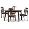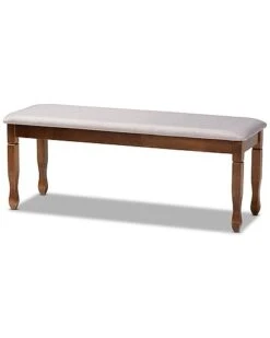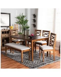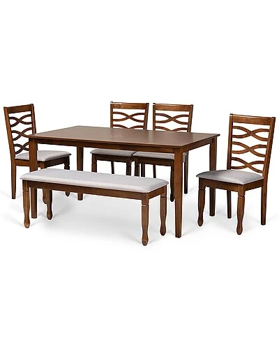 - Elegant yet comfortable, the Lanier dining set is a timeless addition to any space. this wooden set includes four dining chairs, one dining bench, and one table. Each seat is upholstered in a light fabric that complements the walnut wood finish. Designed with both comfort and style in mind, each chair features a plush foam-padded seat, as well as a striking cut-out design on its back. Spade feet add a classic, refined touch. Requiring assembly, the rectangular tabletop provides ample elbow room for each member of the table. Equally enjoyable for both formal dinner parties and casual dinners, the Lanier set is sure to enhance any dining experience. Table Dimensions: 29.13″ high x 59.06″ wide x 35.43″ deep; Legs: 28.35″ high; Bench Dimensions: 18.9″ High x 47.8″ Wide x 16.1″ Deep; Seating Dimensions: 47.8″ Wide x 16.1″ Deep x 18.9″ High (from Floor); Legs: 16.9″ High; Chair Dimensions: 37.4″ high x 17.7″ wide x 20.5″ deep; Seating dimensions: 18.5″ wide x 16.1″ deep x 18.5″ high (from Floor); Back: 18.9″ high; Legs: 16.9″ high;