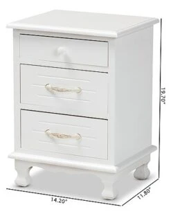 - The stunning Layton nightstand brings modern convenience to your bedside while exuding traditional grace. this nightstand is crafted from sturdy wood. Three drawers provide ample storage space for all your bedside essentials while molded accents showcase the expert craftsmanship. Comes fully assembled, the Layton features a unique visual texture with scalloped edges and shallow perforations. A charming yet efficient addition, the Layton nightstand elevates the modern bedroom. Overall Dimensions: 19.70in High x 14.20in Wide x 11.80in Deep; Drawer Dimensions: 11.40in Wide x 10.20inDeep x 5.30inHigh; Legs: 2.40in High;