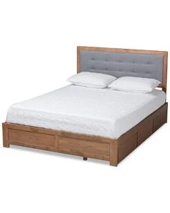 - Utilize your bedroom space to the fullest with the Lene bed. the Lene is constructed from sturdy wood finished in a neutral ash walnut to easily blend in with a large variety of room layouts and styles. Three underside drawers located on one side of the frame supply superb storage potential while maximizing floor space. Assembly is required and a box spring is not needed, as the bed comes with internal slats for mattress support. The headboard is padded with foam and upholstered in smooth fabric accented with button tufting, making the Lene bed a cozy and efficient addition to any bedroom. Over all Dimensions: 58.3″ High x 79.5″ Wide x 83.7″ Deep; Headboard Dimensions: 22.4″ High x 78.1″ Wide x 0.9″ Thick; Dimensions: 13″ High x 79.5″ Wide x 82.8″ Deep; Slats: 78″ Wide x 2.5″ Long x 0.6″ Thick; Top of Slat: 11.8″ High; Legs: 9.1″ High; Inside Dimensions (Mattress Size): 76″ Wide x 80″ Deep; Storage dimensions: 25.5 Wide X 14.1″ Deep X 7.9″ High