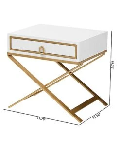 - Uplift the aura of your home with the robust glamour of the Lilibet end table. This energetic piece consists of a wood frame supported by a solid metal base. The drawer offers space to organize household essentials while a rectangular drawer pull stands out with lively opulence. The Lilibet will arrive fully assembled and features crisscross metal legs for excellent stability and support in striking design. Adding a touch luxury while catering to your daily needs, the Lilibet end table is sure to become a beloved storage accessory.