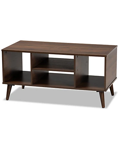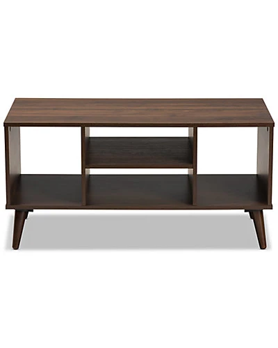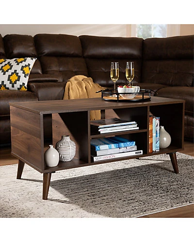 - Design details: Add a dose of retro charm to your living space with the Linas coffee table. This wood coffee table features a spacious tabletop, perfect for a potted plant and a cup of espresso. Four open shelves provide ample space to display magazines, books, and more. Its walnut brown finish and angled legs add a cool, mid-century feel. The Linas coffee table is made in Malaysia and requires assembly.