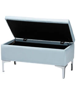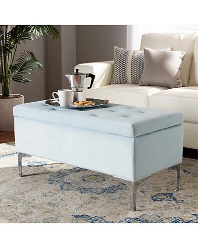 - Design details: Accommodate your living room needs with the functional utility and luxurious style of the Mabel ottoman. Made in China, the Mabel features elaborate button tufting for a touch of modern style. Padded with foam underneath a layer of lavish velvet, this piece is soft to the touch and designed to maximize comfort. The Mabel requires assembly and is raised to a practical height by four silver metal legs at each corner. This versatile piece can be used as a footrest or as extra seating, all while acting as a storage cabinet for busy areas. Dimensions: 16.9″ high x 35.8″ wide x 17.7″ deep; Seating dimensions: 35.8″ wide x 17.7″ deep x 16.9″ high (from Floor); Legs: 6.75″ high; Inner storage dimensions: 33.5″ wide x 15.5″ deep x 7″ high.