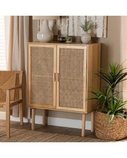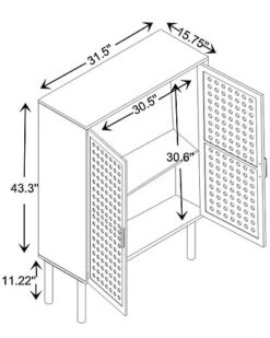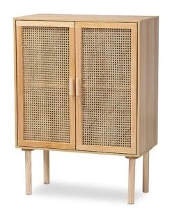 - Presenting a light, airy display, the Maclean storage cabinet accommodates your storage needs. this cabinet is crafted from sturdy wood and accented with natural rattan. Two large shelves behind the doors provide ample space to organize and declutter busy areas of your home. Requiring assembly, the Maclean is supported by rod like legs for a unique outline that exudes charm. A superb upgrade to any interior layout, the Maclean storage cabinet is a delightful addition to the modern home. Overall Dimensions: 43.30in High x 31.50in Wide x 15.70in Deep; Storage Behind Door Dimensions: 30.50in Wide x 14.90in Deep x 30.60in High; Legs: 11.20in High;
