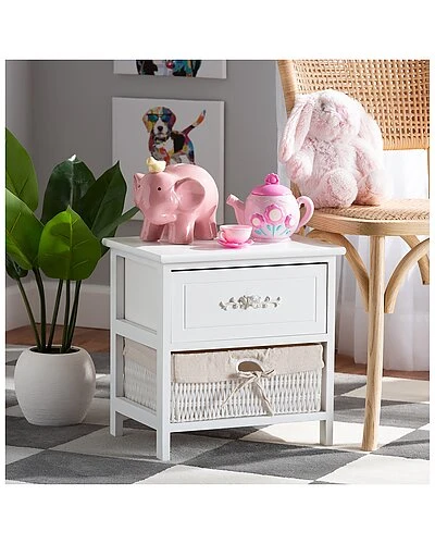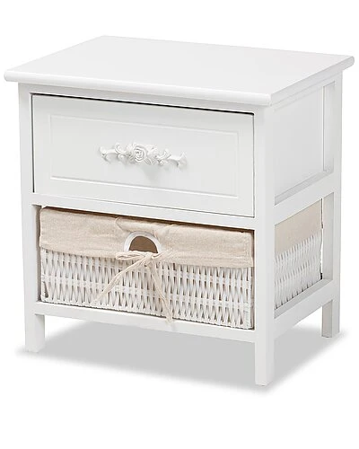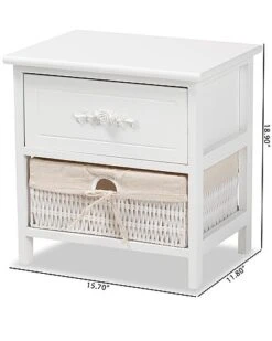 - Charming with convenient utility, the Madelia nightstand adds an elegant accent to your bedroom. Made in China, this handy piece is comprised of a sturdy wood frame fitted with a basket. One drawer adorned with a lovely molded handle and a convenient basket provide on-hand storage for all your bedside essentials. Comes fully assembled, the Madelia features a fabric basket liner for an elegant, contemporary feel. A visually stunning and efficient addition, the Madelia nightstand elevates the character of the modern bedroom. Overall Dimensions: 18.90″ High x 15.70″ Wide x 11.80″ Deep; Drawer Dimensions: 11.81″ Wide x 9.45″ Deep x 5.90″ High; Legs: 2.59″ High;