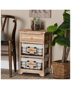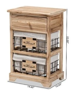 - Generate a cozy, homey feel in your bedroom with the fantastic Madra nightstand. Made in China, this handy piece is comprised of a sturdy wood frame fitted with metal baskets. One drawer and two baskets fitted with wood embellishments provide plentiful storage space to organize your nightly routine. Requiring minor assembly, the Madra features fabric basket liners for a charming, contemporary touch. A convenient piece that radiates modern personality, the Madra nightstand elevates any bedroom. Overall Dimensions: 22.00″ High x 14.6″ Wide x 10.60″ Deep; Drawer Dimension: 11.80″ Wide x 8.70″ Deep x 3.30″ High;