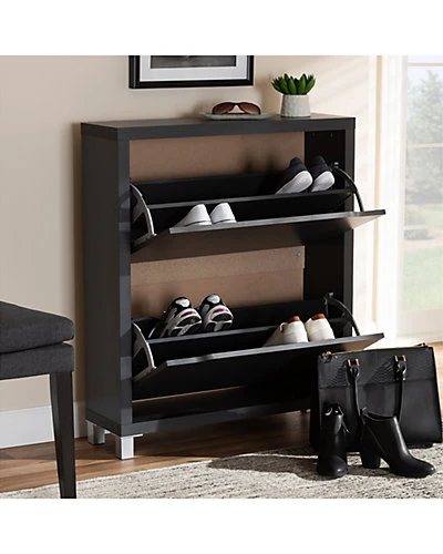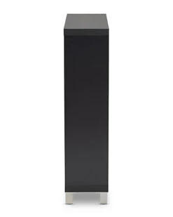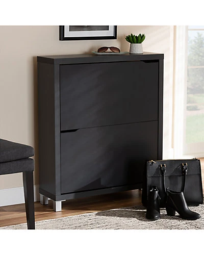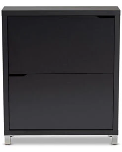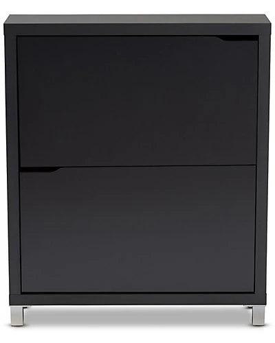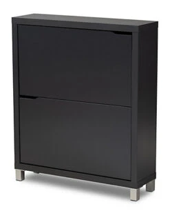 - Design details: The solution to stylish shoe organization lies within the Simms shoe cabinet. This modern cabinet was designed with a low profile to fit neatly against a wall in a hallway, mud room, or entryway. Two fold-out storage compartments provide space to place up to 12 pairs of shoes. Silver plastic legs add refined style and provide elevation to deter dust buildup. Constructed from engineered wood, the Simms showcases a sleek dark grey finish that complements modern interiors. The Simms shoe cabinet is made in Malaysia and requires assembly.