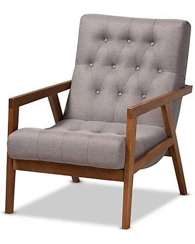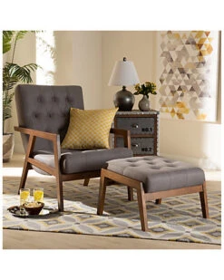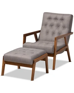 - Design details: Soft curves are paired with sharp angles to give the Navea armchair and footstool set a cool retro look. Constructed from wood, each piece is upholstered in a soft grey fabric that complements the walnut finish on the wood. Plush foam padding and the deep, curved seat provide ample lounging comfort. Additional comfort is provided by the foam padded stool, which can be used as a footrest or as an extra seat. Inspired by mid-century design, each piece features a low profile and angled legs. The Naeva armchair and footstool set is made in Malaysia and requires assembly.