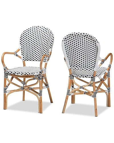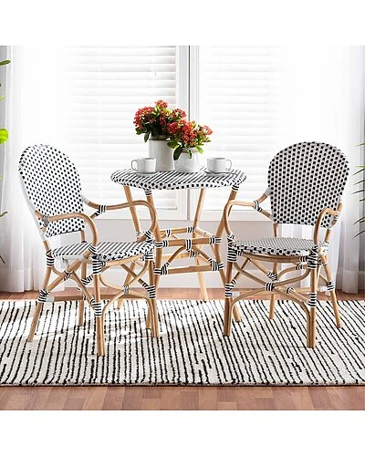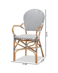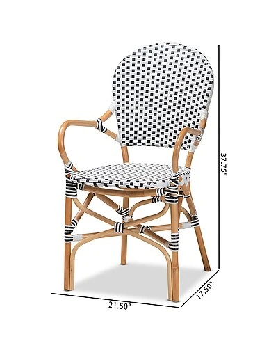 - Recreate the ambiance of a lovely French bistro in your space with the expertly crafted Naila dining chair. this chair is comprised of a natural rattan frame wrapped in black and white plastic woven. Its round backrest offers smooth support while convenient armrests offer enhanced comfort. The Naila will arrive fully assembled and utilizes angled legs connected by a crisscross base for excellent stability and support. Delivering an enchanting charm to any occasion, the Naila dining chair elevates every dining experience.
