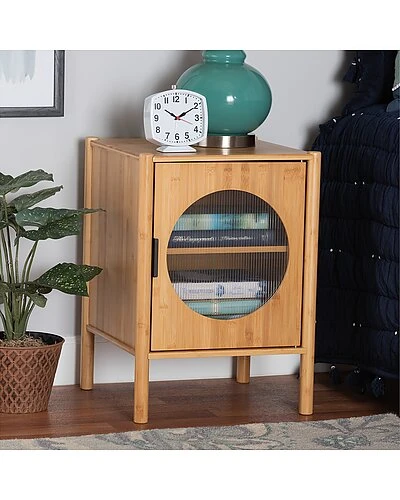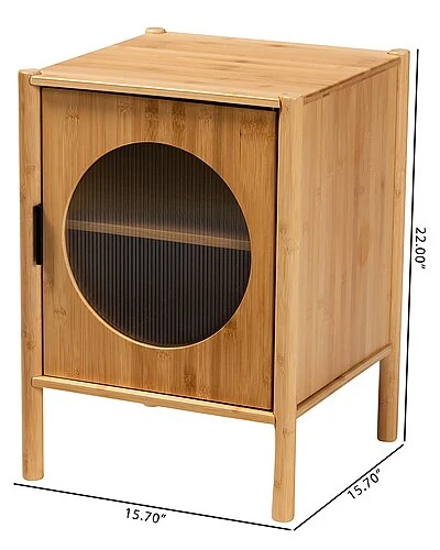 - Express a style of casual elegance in your space with the carefree flair of the Naresh end table. This stunning piece exudes mid-century charm with a bamboo frame embellished with a circular see-through window. The door opens to reveal two shelves that efficiently organize household essentials while reserving the tabletop for daily use. The Naresh requires assembly and features a minimalist door handle to draw attention to the natural grain of the wood. Clean lines and rounded legs produce a delightful silhouette, making the Naresh end table a chic accent in any layout.
