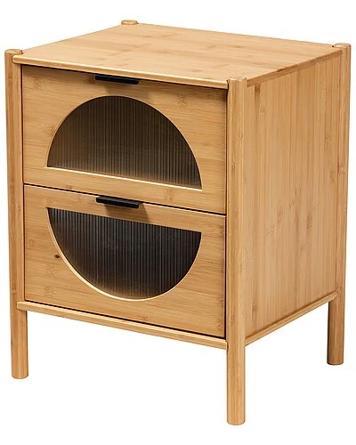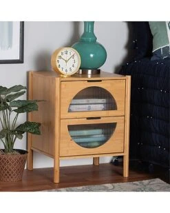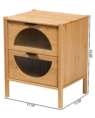 - Express a style of casual elegance in your space with the carefree flair of the Naresh end table. This stunning piece exudes mid-century charm with a bamboo frame embellished with crescent windows. Two drawers offer space to organize your household while reserving the tabletop for daily use. The Naresh requires assembly and features minimalist drawer handles to draw attention to the natural grain of the wood. Clean lines and rounded legs produce a delightful silhouette, making the Naresh end table a chic accent in any layout.