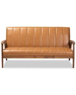 - The Nikko sofa is a stunning and eye-catching piece perfect for adding personality to any space. the Nikko is constructed from sturdy wood padded with soft foam and upholstered in smooth, tan-colored faux leather. The angular frame showcases warm walnut tones and features long legs that form ergonomic armrests. Requiring assembly, sleek channel tufting provides unique visual charm while ensuring plush comfort that lasts. With a nod to mid-century design, the Nikko sofa is an ideal accent piece for the modern home. Dimensions: 31.9″ High x 64″ Wide x 29.7″ Deep; Seating Dimensions: 16.25″ High (from Floor) x59″ Wide x 21″ Deep; Back: 15.65″ High; Legs: 10″ High;