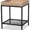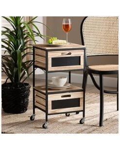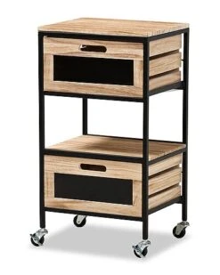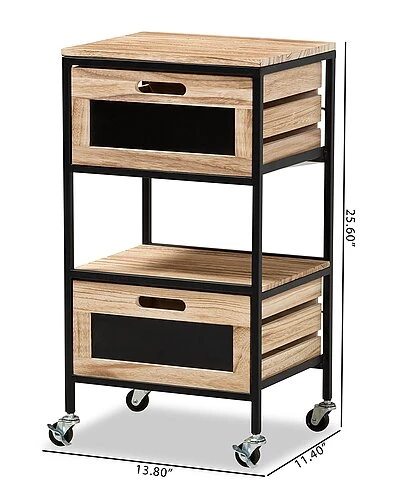 - The ergonomic design of the Olinda end table adds modern convenience to any interior. Made in China, this table is comprised of a solid metal frame fitted with sturdy wood. Two open shelves create a handy display for essentials, while two drawers offer secure storage space. Requiring minor assembly, the Olinda features wheeled casters for smooth mobility as needed. Cut-out accents complement the minimalist metal frame, making the Olinda end table a remarkable addition to the modern home. Overall Dimensions: 25.60″ High x 13.80″ Wide x 11.40″ Deep; Drawer Dimension: 12.60″ Wide x 10.80″ Deep x 5.50″ High; Legs: 2.90″ High; 4.30