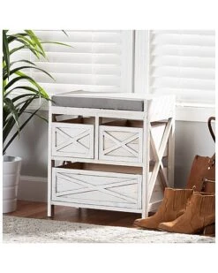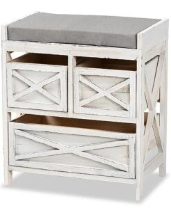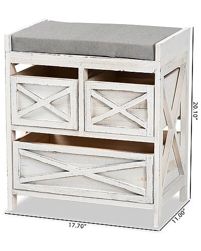 - Bringing forth the aesthetic of the modern farmhouse, the Parra storage bench delivers convenient storage in alluring design. Made in China, this bench is comprised of a sturdy wood frame. Three drawers adorned with a crisscross embellishment provide excellent storage space while lending a cool, geometric feel. Comes fully assembled, the Parra features a cushion padded with plush foam and upholstered in smooth fabric for superb comfort. A handy and visually appealing solution to your storage needs, the Parra storage bench adds a countryside feel to the modern entryway. Overall Dimensions: 20.10″ High x 17.70″ Wide x 11.00″ Deep; Seating Area Dimensions: 16.50″ Wide x 11.00″Deep x 20.10″High; Drawer Dimensions: 9.50″ Wide x 15.75″ Deep x 5.00″ High; Big Basket/Crate Dimensions: 9.50″ Wide x 15.80″ Deep x 10.80″ High; Small Basket/Crate Dimensions: 9.30″ Wide x 7.00″ Deep x 5.00″ High; Legs: 2.00″ High;
