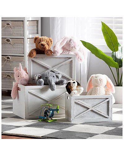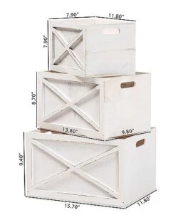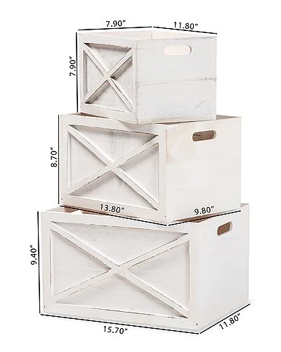 - Bringing forth the aesthetic of the modern farmhouse, the Parra crate set delivers convenient storage in alluring design. Made in China, this set include three crates made from sturdy wood. Each crate utilizes a unique size depending on your needs as well as a crisscross embellishment that lends a cool, geometric feel. The Parra will arrive fully assembled and features ergonomic cut-out handles for easy transport. A handy and visually appealing solution to your storage needs, the Parra crate set adds a countryside feel to any space. Large Crate Dimensions: 9.40″ High x 15.70″ Wide x 11.80″ Deep; Medium Crate Dimensions: 8.70″ High x 13.80″ Wide x 9.80″ Deep; Small Crate Dimensions: 7.90″ High x 11.80″ Wide x 7.90″ Deep;