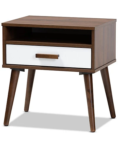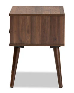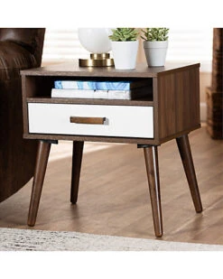 - Design details: Enhance your living room or bedroom with the compact retro design of the Quinn end table. Constructed from wood, the Quinn features a playful two-tone walnut brown and white finish. One drawer provides space to store remotes, manuals, and more. Angled, tapered legs add a charming mid-century look. Use this versatile piece as an end table in the living room or as a nightstand in the bedroom. The Quinn end table is made in Malaysia and requires assembly.