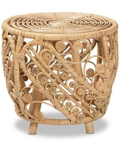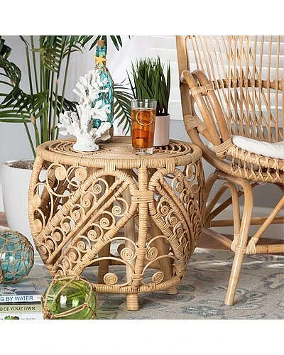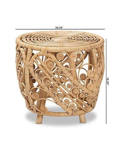 - Inject a touch of artistic expression to your interior with the remarkable style of the Saranna end table. Made in Indonesia, this table is comprised of a rattan frame adorned with geometric embellishments. Its rounded tabletop serves as a wonderful pedestal for your daily needs while curled accents lend visual intrigue. The Saranna will arrive fully assembled and utilizes angled legs concealed by the frame for excellent stability and support. Inspired by tropical aesthetics, the Saranna end table is a lovely addition to any space.