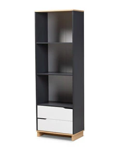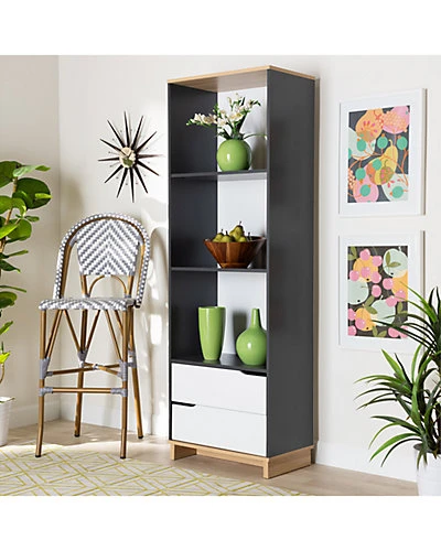 - Design details: Create a playful retro feel in your living space with the Reed bookshelf. Constructed from wood, the Reed features a complementary color palette of white, oak, and grey for a cool, modern look. Three tall shelves provide ample space to display books, decor, and plants, while two spacious drawers provide concealed storage space. Cut-out handles add a unique touch. The Reed bookshelf is made in Malaysia and requires assembly.
