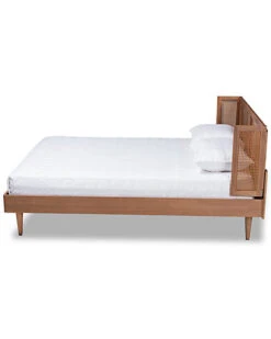 - Design details: Cultivate a vintage chic vibe in your bedroom with the Rina bed. Built with a low platform set on top of angled, tapered legs, the Rina exhibits all the hallmarks of stylish mid-century modern design. The wrap-around headboard features panels of exquisitely woven synthetic rattan that create a cozy, airy ambiance. Constructed from wood, the Rina displays a classic walnut brown finish that adds warmth to any space. The Rina bed is made in Malaysia and requires assembly.