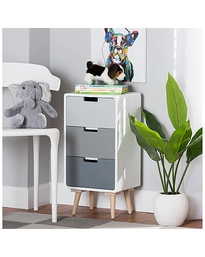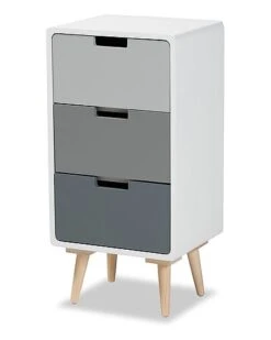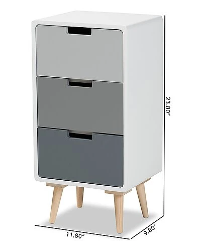 - A beautiful execution of modern minimalism, the Bairn storage cabinet brings sophisticated storage to any space. Made in China, this cabinet is crafted from sturdy wood. Three drawers featuring cut-out handles offer ample space to organize busy areas of your home in sleek, streamlined design. Requiring assembly, the Bairn utilizes angled legs for excellent stability and support that add a charming, mid-century touch. A fantastic addition that blends well with modern layouts, the Bairn storage cabinet is sure to leave an impression. Overall Dimensions: 23.80″ High x 11.80″ Wide x 9.80″ Deep; Drawer Dimension: 10.60″ Wide x 8.90″ Deep x 4.70″ High; Legs: 5.10″ High;