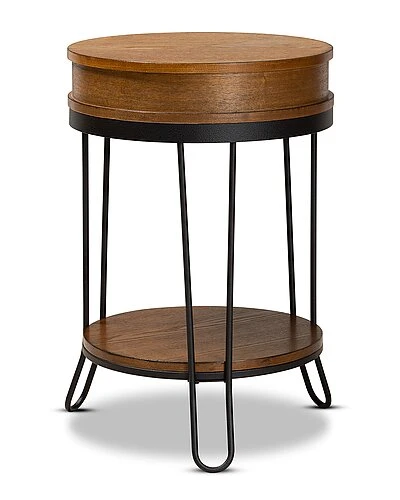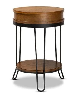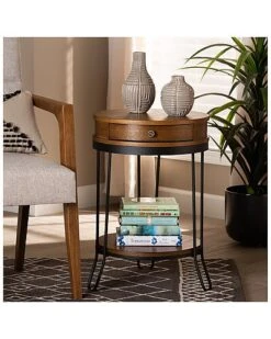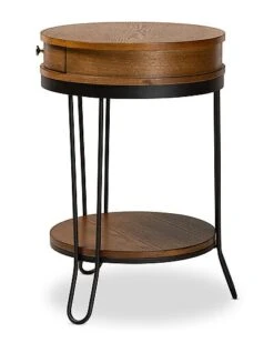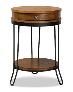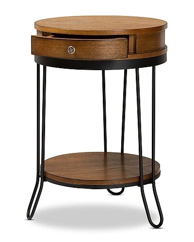 - Add vintage industrial charm to your space with the stunning Roald end table. the Roald is comprised of a black finished metal frame fitted with walnut brown finished wood shelves. One drawer provides storage space, while a lower shelf accommodates larger items or decorations. Requiring assembly, the table is accented with a decorative antique gold finished knob for an added vintage touch. The unique contrast of wood and metal distinguishes the Roald as an exceptional addition to any home. Dimensions: 25.4″ High x 16.9″ Wide x 16.9″ Deep; Drawer: 1.75 ” H x 7.75″ W x 10.25″D; Shelf: 14.25″ H x 15.5″ W x 15.5″ D