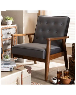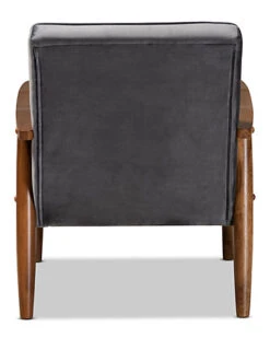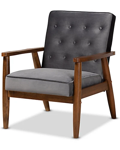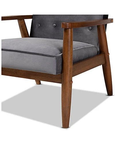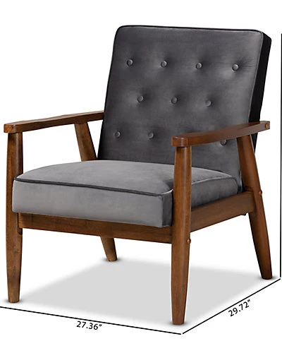 - Design details: A simple, post-modern design that works well with a variety of styles, the Sorrento lounge chair is upholstered in a grey velvet fabric and features a rubberwood frame. The sculptural arms and wide, welcoming seat are a throwback to classic 1950s and 1960s Danish design. Splayed legs and button-tufting add a retro modern touch. The fully upholstered seat with exposed dark walnut wood looks great from all angles, whether in a lounge arrangement, public waiting area or private office. Its light weight and easy handling also make it suitable for those urban dwellers with limited space. The Sorrento lounge chair is made in Malaysia and requires assembly.