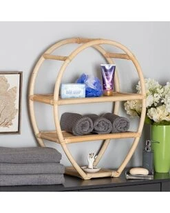 - Liven up your interior with the eye-catching yet efficient design of the Ruana display shelf. Made in Indonesia, this shelf is comprised of a rattan frame fitted with woven shelves. Three tiers of shelves create a stunning platform to organize and display decorations or household essentials. The Ruana will arrive fully assembled and features a unique, rounded frame inspired by exotic craftsmanship. A handy yet visually striking addition, the Ruana display shelf organizes your space in extraordinary style.