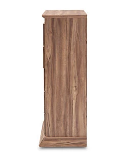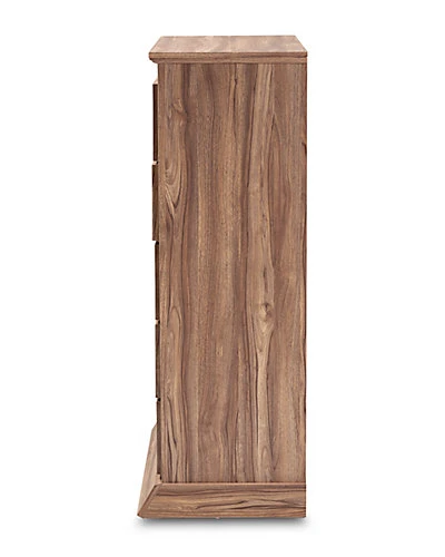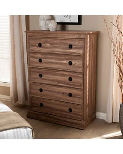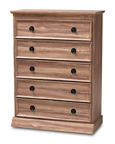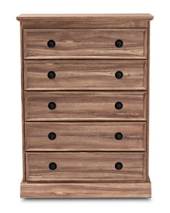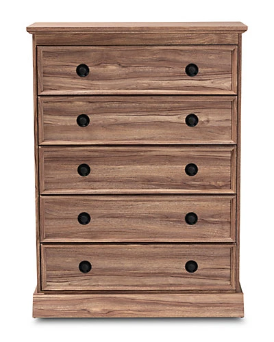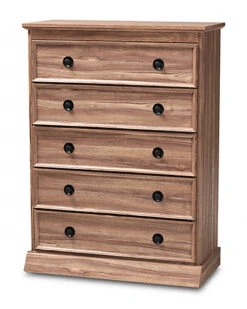 - Design details: Natural wood tones and ample storage space make the Ryker chest an effortless addition to any bedroom. This engineered wood chest features five spacious drawers to store clothes, linens, and more. Each drawer is fitted with metal glides for smooth movement. Modern black plastic knobs complement the traditional oak finish. Combine the Ryker chest with the Ryker dresser and nightstand to complete the look. The Ryker chest is made in Malaysia and requires assembly.
