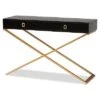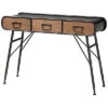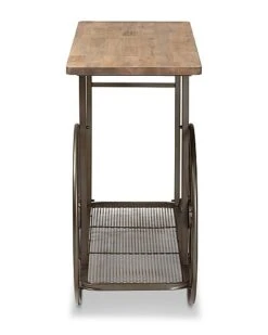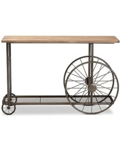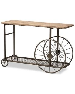 - Add rustic charm to your space with the Terence console table. the Terence is comprised of a black finished metal frame fitted with a natural finished wood tabletop. A lower mesh metal shelf keeps various items on hand while organizing clutter. Requiring assembly, the Terence is fitted with decorative wheels that lend a unique, eye-catching aesthetic. Bring some vintage charisma to your space with the Terence console table. Dimensions: 30″ High x 48.6″ Wide x 15.6″ Deep; Lower Shelf:25.25″ H x 46.25″ W x 13.25″ D