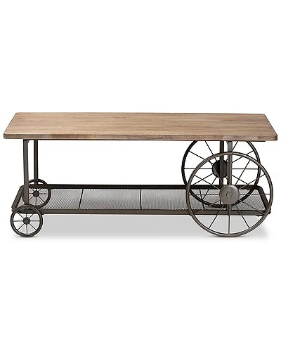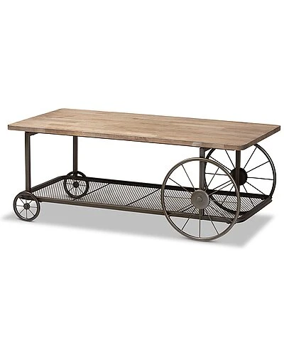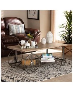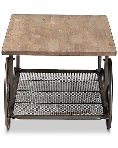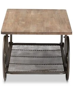 - Add rustic charm to your space with the Terence coffee table. the Terence is comprised of a black finished metal frame fitted with a natural finished wood tabletop. A lower mesh metal shelf keeps various items on hand while organizing clutter. Requiring assembly, the Terence is fitted with decorative wheels that lend a unique, eye-catching aesthetic. Bring some vintage charisma to your space with the Terence coffee table. Dimensions: 17.7″ High x47″ Wide x 23.4″ Deep; Shelf: 45.5″ W x 20.75″ D x 13″ H