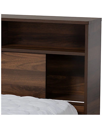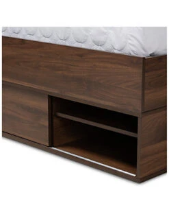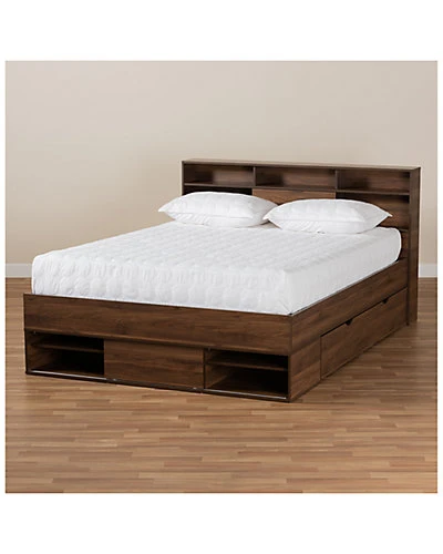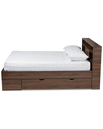 - Sharp, neat angles along with excellent storage capabilities make the Tristan bed a fantastic addition to the modern bedroom. Storage compartments of various sizes are found within the headboard and footboard of the Tristan, and each section comes with a unique sliding wood panel to hide specific shelves from view. Made in Malaysia, the underside side of the bed is also fitted with a single, double-sized storage drawer that can accommodate a wide range of items. Assembly is required and a box spring isnt necessary, as the Tristan comes with a paneled platform base for mattress support. The wood gives this piece a relaxed look, making for an attractive piece well suited for the modern bedroom. Dimensions: 39.76″ high x 62.44″ wide x 93.94″ deep; Height from floor to top of slat: 23.43″ high; Inside dimensions (mattress size): 60″ wide x 80″ deep.