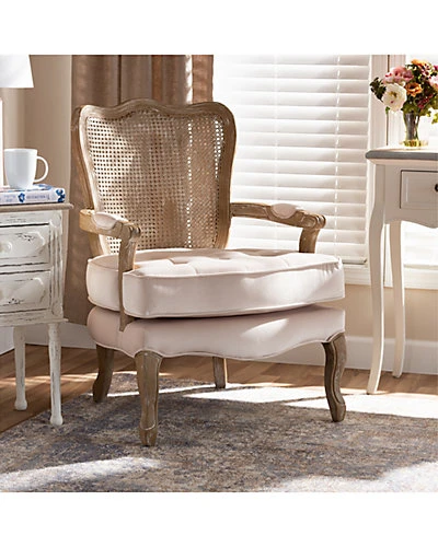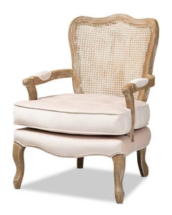 - Design details: Bring French elegance to your living room with the Vallea armchair. Constructed from solid oak wood, the Vallea showcases a white-washed natural finish for an aged appearance. The armchair is upholstered in a soft, sumptuous velvet fabric and features padded armrests and a thick foam-padded seat for the utmost comfort. Stunning craftsmanship is displayed on the intricately woven bamboo back, as well as the elegant carvings in the wood frame. Charming cabriole legs complete the look. The Vallea armchair is made in China and will arrive fully assembled.