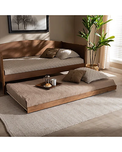 - Design details: Provide convenient accommodation for overnight guests with the Veles trundle. The Veles is fitted with four wheels to function as roll-out trundle underneath a twin size bed frame. Its simple, contemporary design and walnut brown finish are complementary to many bed styles. This trundle is designed for use with one twin size mattress. The Veles trundle is made in Malaysia and requires assembly