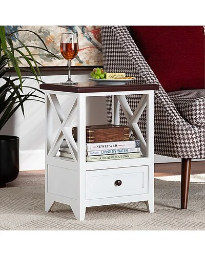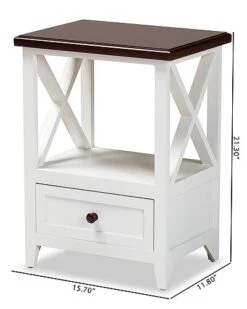 - Put the finishing touches on your interior with the fantastic Vesta end table. this handy piece is crafted from sturdy wood. One open shelf creates a lovely display for decorations while the drawer offers more secure storage space. Comes fully assembled, the Vesta features crisscross side beams that allow light to flow more easily throughout the room while lending a cool, geometric look. Inset paneling completes the look, making the Vesta end table a remarkable addition to any space. Overall Dimensions: 21.30in High x 15.70in Wide x 11.80in Deep; Drawer Dimensions: 12.00in Wide x 10.20inDeep x 5.50inHigh; Open Storage Dimensions: 12.00in Wide x 10.20inDeep x 10.20inHigh; Legs: 2.80in High;