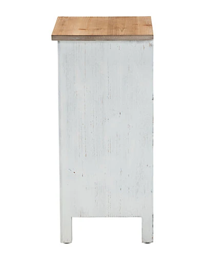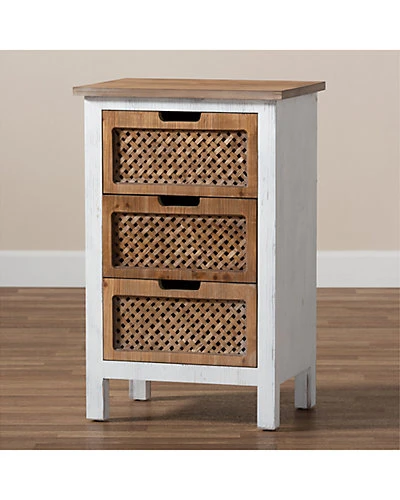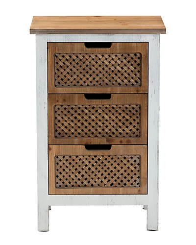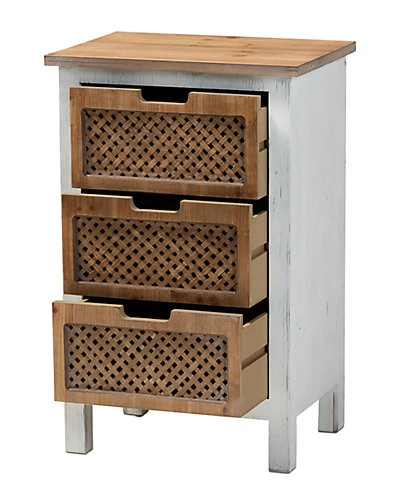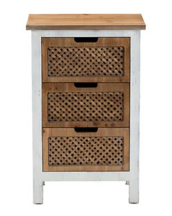 - Design details: Bring order to busy rooms with the unique look of the Vincent chest. Made in Malaysia, the Vincent provides plentiful storage space in the form of three drawers, perfect for rooms with limited space. A striking oak finished wood top makes the chest a great pedestal for decorations. Fully assembled, the chest showcases a weathered white wood finish that complements the natural finish on the top and drawers. The woven design on the drawer faces lends a casual, retro look, while cut-out handles add a modern touch. Dimensions: 29.5″ high x 18.9″ wide x 13.8″ deep; Drawer dimensions: 5.9″ high x 13.8″ wide x 11.8″ deep; Legs: 3.9″ high.