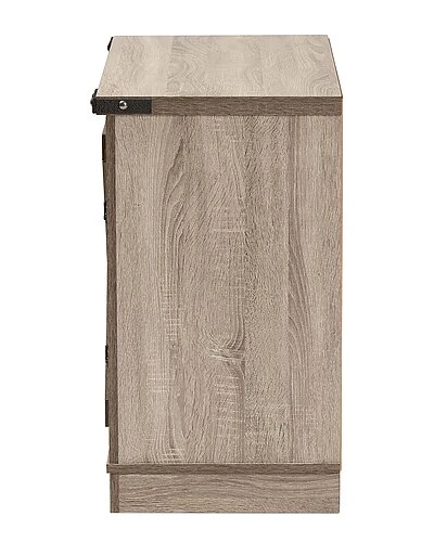 - Featuring an eye-catching farmhouse inspired design, the Wayne shoe cabinet is a stylish solution to organizing your entryway. the Wayne is crafted from sturdy wood finished in a light oak brown. The hinged doors reveal three spacious shelves capable of storing around 9 pairs of shoes, depending on size. Requiring assembly, the large, rectangular tabletop offers ample surface area to place keys, mail, and other miscellaneous items. Showcasing a striking aesthetic that adds personality to any space, the Wayne shoe cabinet is sure to elevate any home. Overall Dimensions: 27.9″ High x 31.5″ Wide x 15.75″ Deep; Top Shelf: 29.75″ W x 12″ D x 7.75″ H; Middle Shelf: 29.75″ W x 12″ D x 7.25″ H; Bottom Shelf: 29.75″ W x 14.75″ D x 8″ H